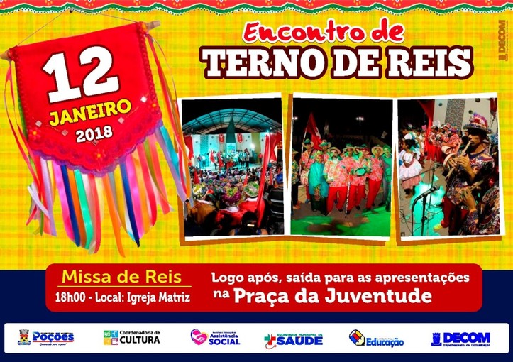 Com o objetivo de manter viva a tradição de seu povo, a Prefeitura Municipal de Poções, por meio da Coordenação de Cultura, realizará o tradicional Encontro de Terno de Reis. O evento cultural acontece no dia 12 de janeiro, a partir das 18h, com Missa de Reis na igreja Matriz, saindo para pelas ruas da cidade com destino o anfiteatro da Praça da Juventude, onde acontecerá as apresentações. O Encontro de Ternos de Reis revelam a cultura, a fé e a alegria do povo poçoense.