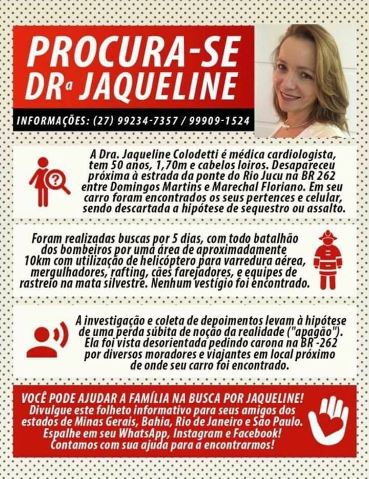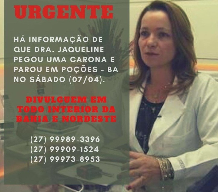 Familiares e amigos da médica Jaqueline da Penha Colodetti,que desapareceu no dia 03/04 em Domingos Martins/ES, entraram em contato com Portal Poções para informar que receberam informações que ela teria sido vista em Poções. Jaqueline é cardiologista, ela tem 50 anos, é magra, tem 1.70m de altura e cabelos loiros.