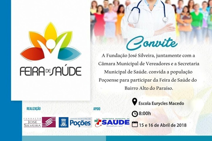 Nos dias 15 e 16 de Abril, a Fundação José Silveira com apoio da Secretaria Municipal de Saúde e da Câmara de Vereadores realiza feira de saúde em Poções. No dia 15/04/ serão oferecidos atendimentos de saúde, clínica médica, ginecologia, pediatria, urologia, exame de ultrassonografia, cardiologia com realização de eletrocardiograma, exame preventivo de câncer do colo uterino, odontologia com orientação e prevenção da saúde bucal. No dia 16/04 será oferecido: clínica médica, pediatria, cardiologia com realização de eletrocardiograma, exame preventivo de câncer do colo uterino, odontologia com orientação e prevenção da saúde bucal. A feira será na Escola Euricles Macedo – Bairro: Alto Do Paraíso. Para ser atendido é só levar rg, comprovante de residência e cartão sus. Para ultrassonografia é necessária a requisição médica. Os atendimentos são por ordem de chegada e as vagas limitadas. E a Fundação José Silveira levando mais saúde à Bahia.