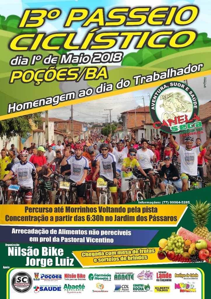 Acontece nesta terça-feira (01 de Maio), o 13º Passeio Ciclístico em homenagem ao Dia do Trabalhador. O evento é aberto à participação de pessoas de todas as idades, o passeio terá como ponto de partida o Jardim dos Pássaros, às 06h30, com percurso até Morrinhos. Na chegada haverá uma mesa de frutas e sorteio de brindes. A participação é livre – sem a necessidade de inscrições. Na oportunidade os organizadores estarão arrecadando alimentos não perecíveis em prol da Pastoral Vicentino. Considerado o maior evento de ciclismo da região, o evento é organizado por Nilsão Bike e o vice-prefeito Jorge Luís.
