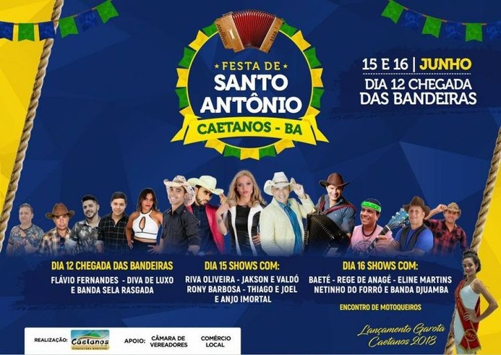 A Tradicional Festa de Santo Antonio vai movimentar a cidade de Caetanos nos dias 15 e 16 de Junho. Na sexta (15) acontecem os shows de Riva Oliveira, Jakson e Valdo, Rony Barbosa, Thiago e Joel e Anjo Imortal. Já no sábado (16) a festa fica por conta de Baeté, Rege de Anagé, Eline Martins, Netinho do Forró e Djuamba. O evento é considrado a maior festa de Santo antonio da região e é realizado pela Prefeitura Municipal de Caetanos com apoio da câmara Municipal de Vereadores.