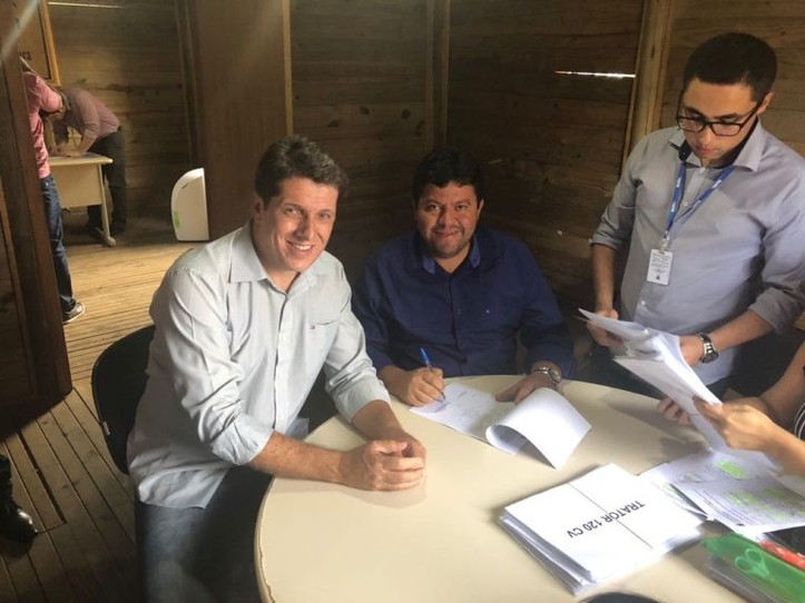 O Coordenador dos Consórcios Públicos da Bahia, Zenildo Brandão, Zé Cocá, ladeado do presidente do Consorcio do Vale Jiquiriçá e prefeito de Lafaiete Coutinho, João Freitas, juntos ao governador Rui Costa participaram, nesta segunda-feira (18), do lançamento do Plano Safra da Agricultura Familiar 2018/2019, conjunto de ações voltadas para o fortalecimento dos produtores. O evento realizado no Parque de Exposições de Salvador, situado na Avenida Luiz Viana Filho (Paralela), contou com a presença dos prefeitos das cidades baianas que assinaram o termo de adesão ao Programa Garantia-Safra.