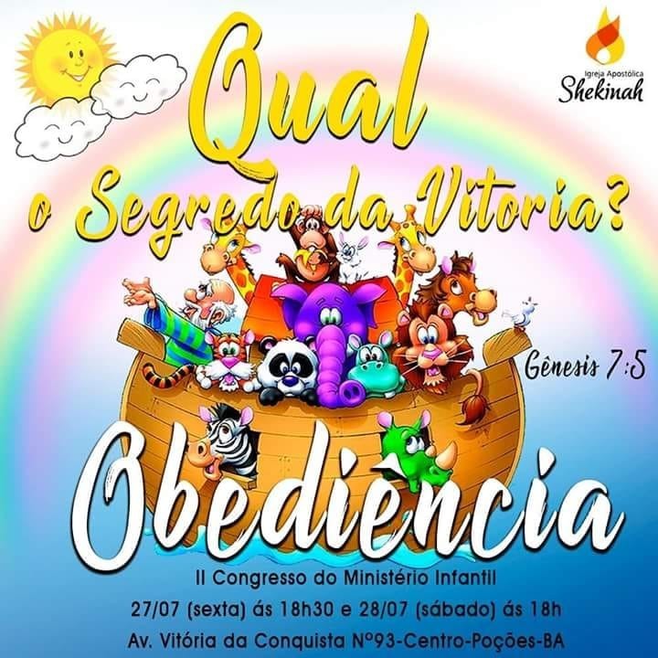 Acontece no próximo dia 27 de Julho na Igreja Apostólica Shekinah o ll Congresso do Ministério Infantil com o tema Obediência. Para esse importante evento, a Pastora Marta Yanne convida toda população para participar. A Igreja Apostólica Shekinah fica localizada na Avenida Vitória da Conquista, 93, Centro de Poções. Participe!