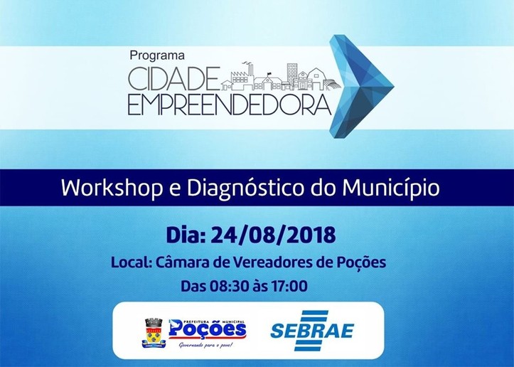 Com o objetivo de iniciar a implantação do Programa Cidade Empreendedora, em parceria com o SEBRAE, a Prefeitura Municipal de Poções convida a todos para participarem do Workshop e Diagnóstico do Município, que será realizado no dia 24/08 (sexta-feira), das 08:30 às 17:00 (com intervalo para almoço), na Câmara de Vereadores de Poções. O programa tem como desafio engajar a gestão pública municipal e as lideranças locais para a melhoria do ambiente empresarial e a promoção de políticas públicas de desenvolvimento econômico local, por meio da efetivação de um Plano Municipal de Desenvolvimento dos Pequenos Negócios, visando o fortalecimento do ambiente de negócios. Participe! DECOM-PMP