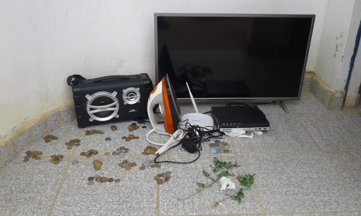 Nesta Quarta-feira(28) policiais militares da 79ª CIPM prenderam dois homens após terem furtado uma loja de móveis em Mirante. Os militares foram acionados pelo proprietário da Líder Móveis, que percebeu que seu estabelecimento havia sido furtado na noite anterior. Após este verificar as câmeras de segurança do estabelecimento, informou que o provável suspeito seria um morador da cidade chamado Marcio Kléber. Chegando na residência do suspeito, foram encontrados dois homens que ao perceberem a presença da viatura policial, empreenderam fuga, sendo de imediato imobilizados pela guarnição. Com a colaboração de populares, a guarnição conseguiu localizar Márcio Kléber. O mesmo confirmou que foi o autor do furto e que todos objetos estavam em sua residência. Os envolvidos e todo os materiais apreendidos foram apresentados à autoridade policial local, para que fossem tomadas as medidas cabíveis. Apresentados: Marcio Kleber Santos Silva(32); Eduardo Tadeu Teixeira de Novais(18). Materiais apreendidos: 01 TV 32″ Toshiba; 01 Som em caixa Philco; 01 Ferro a vapor Black Decker; 01 DVD Mondial; 01 roteador Intelbrás; R$ 28,00 em moedas; R$ 10,00 em espécie; 01 papelote de substancia análoga à maconha; 02 pés de maconha.