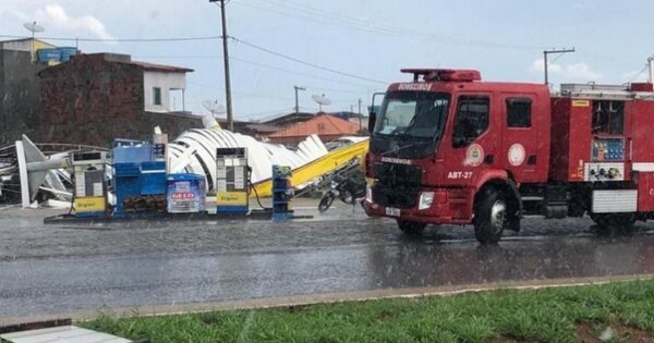 Tempestade em Jequié: temporal destrói cobertura de posto de combustíveis, alaga ruas e derruba ao menos vinte árvores