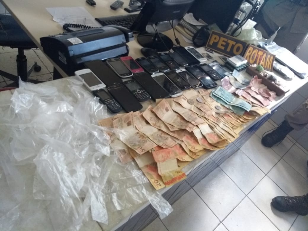 Na manhã desta sexta-feira (14), policiais militares da 79ª CIPM prenderam em Poções cinco pessoas por tráfico de drogas, formação de quadrilha, sendo um deles foragido da justiça. A guarnição chegou ao local após uma denúncia anônima, que na rua professora Alzira, Bairro Primavera, havia um indivíduo foragido da justiça comercializando entorpecentes juntamente com outros comparsas. Ao chegar no local, os militares visualizaram um homem identificado como Lindomar de Jesus, foragido da justiça, juntamente com 04 pessoas em atitude suspeita, próximos à sua residência. Foi realizada a abordagem policial e durante as buscas foram encontrados celulares, drogas, balança de precisão, dinheiro em espécie, caderneta com anotações e várias embalagens utilizadas para armazenar drogas. Diante dos fatos, Lindomar de Jesus (não soube informar a idade), Anderson Santos da cruz (27), Gildásio de Jesus (20), Rogério Rodrigo Silva (38), Jocilene Maria de Jesus (45) conduzidos à delegacia de Poções onde foram autuados em flagrante.