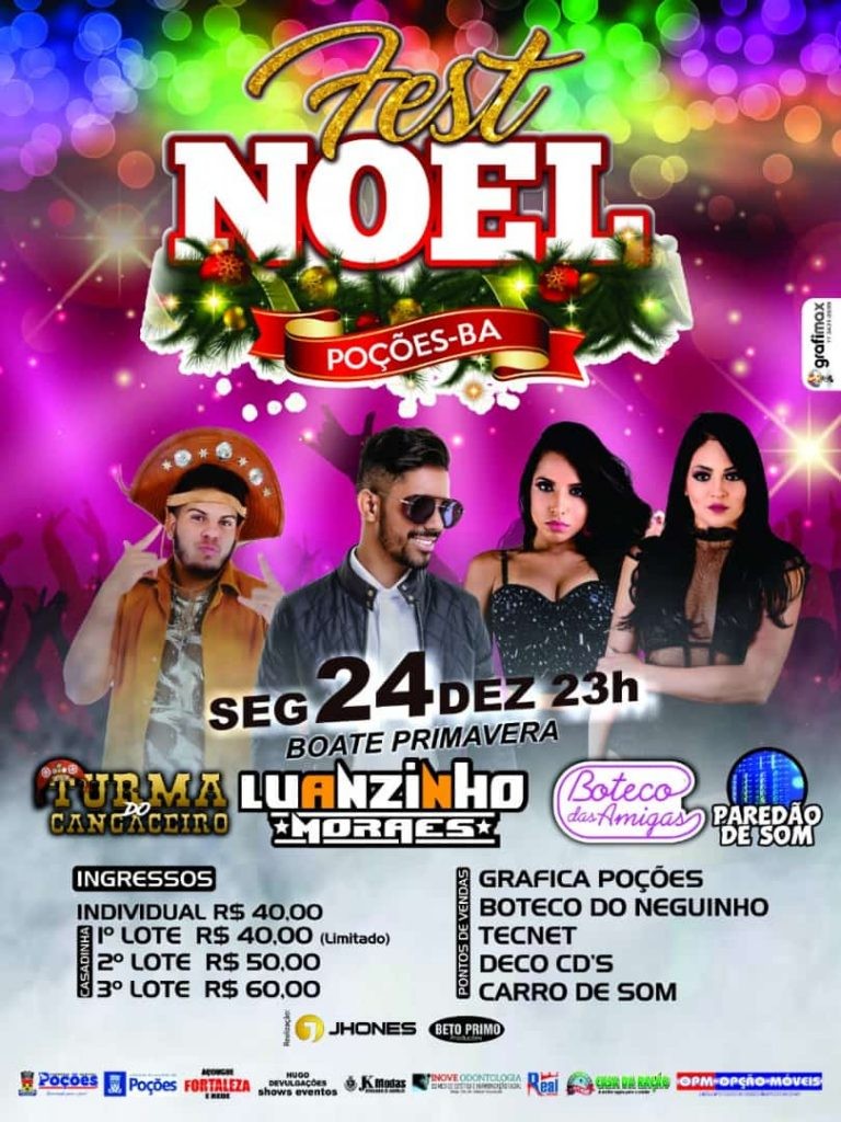 Na noite da próxima segunda-feira (24), a Área de Eventos Primavera vai receber a festa mais esperada do ano, o Fest Noel 2018. O evento realizado por Jhones Produções, Beto Primos e Cacique contará ainda com os shows de Luanzinho Moraes, Boteco das Amigas e Turma dos Cangaceiros. Luanzinho vem sendo sucesso em todo estado e fará show com as músicas que estão estouradas no rádio e na internet. Ingressos casadinhas antecipados custam apenas R$ 50,00. Corra e garanta já seu ingresso!