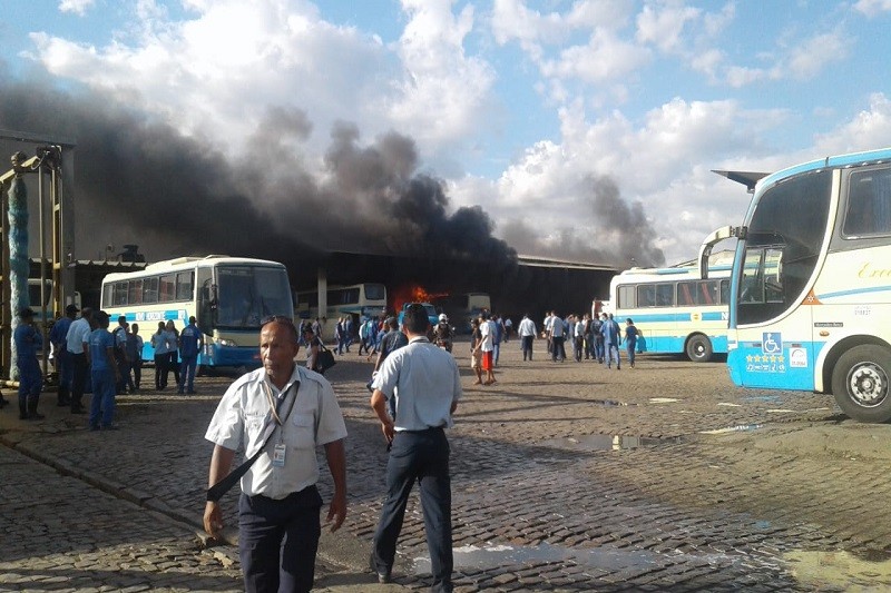 Um incêndio de grandes proporções atinge a sede da Viação Novo Horizonte, localizada na Avenida Presidente Dutra, próximo ao Terminal Rodoviário Intermunicipal de Vitória da Conquista. Às 16h55min a equipe do Blog do Anderson esteve no local onde agentes do 7º Grupamento de Bombeiros Militar combatem as chamas. Funcionários deixaram suas salas e acompanham o trabalho dos bombeiros à distância. Uma ambulância do Serviço de Atendimento Móvel de Urgência e guarnição da 78ª Companhia Independente de Polícia MIlitar também estão na sede da companhia. Conforme as imagens, o fogo está concentrado na parte da oficina dos veículos.