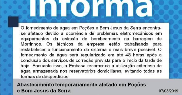 A Empresa Baiana de Águas e Saneamento (Embasa) informa que o fornecimento de água no Sistema Integrado de Abastecimento de Poções encontra-se afetado nesta quinta (07) após a ocorrência de problemas eletromecânicos em equipamentos da estação de bombeamento na barragem de Morrinhos. Os técnicos da empresa estão trabalhando para restabelecer o funcionamento do sistema o ... -