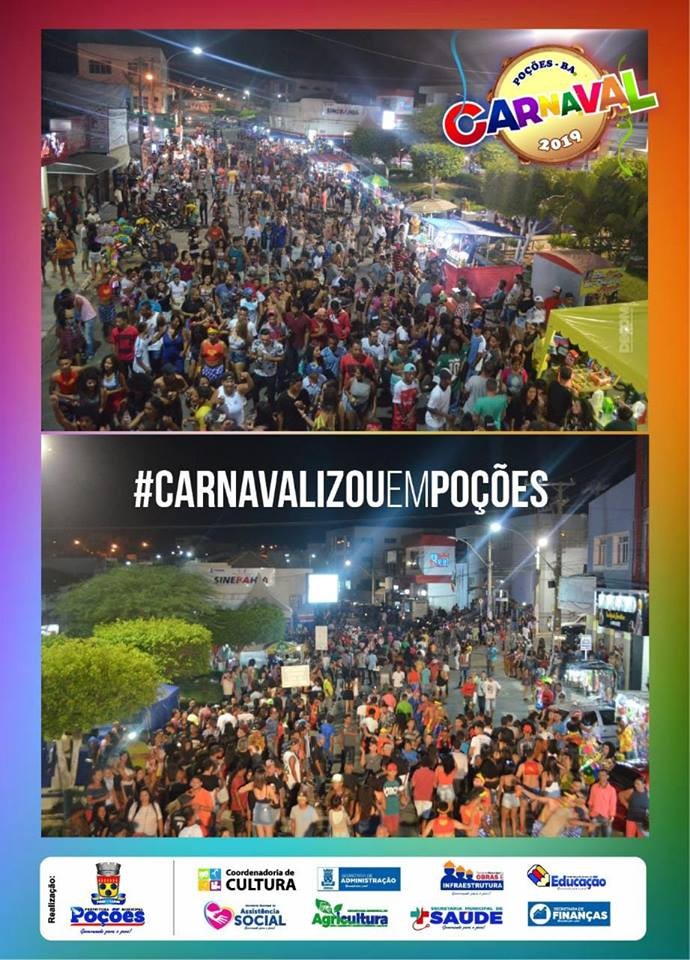 A Prefeitura Municipal de Poções, por meio da Coordenadoria de Cultura, realizou o Carnaval 2019 com muita competência e o destaque ficou por conta da participação do grande público que prestigiou o evento; foram três dias de muita alegria, diversão e paz. Com início da programação cultural na sexta-feira (15), a prefeitura manteve a tradição de valorizar os artistas e grupos culturais locais no pré-carnaval.