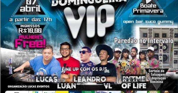 Acontece neste domingo (7) na Boate Primavera, em Poções, a Domingueira Vip com DJ Lucas, DJ Luan, DJ Leandro e DJ VL, além da apresentação de Rytme Of Life e paredão nos intervalos. A Festa é opem bar com suco Gummy. O evento terá inicio as 17h e os ingressos custam R$ 10,00. Mulher tem ... -