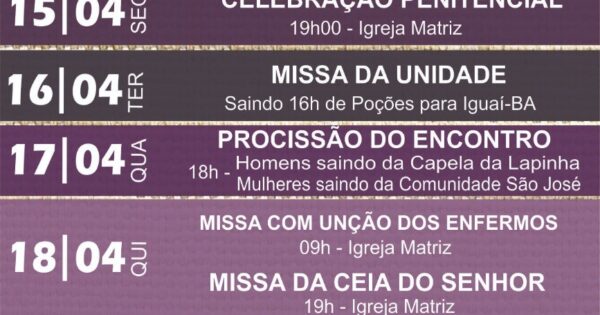 A Paroquia do Divino Espirito Santo divulgou nesta semana a programação da Semana Santa, em Poções. De acordo informações, a programação começa no domingo (14) e vai até o próximo domingo de páscoa (21) com missas, procissões e celebrações pela cidade. Confira a programação da Semana Santa 2019 na Paróquia do Divino!