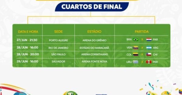 Encerrado a primeira fase da Copa América foram definidos os confrontos das quartas de final. O Brasil, que passou em primeiro no grupo A com 7 pontos, vai enfrentar a seleção do Paraguai que ficou na terceira colocação no grupo B. A partida vai acontecer na próxima quinta-feira, 21h30, na Arena do Grêmio. Os outros ... -