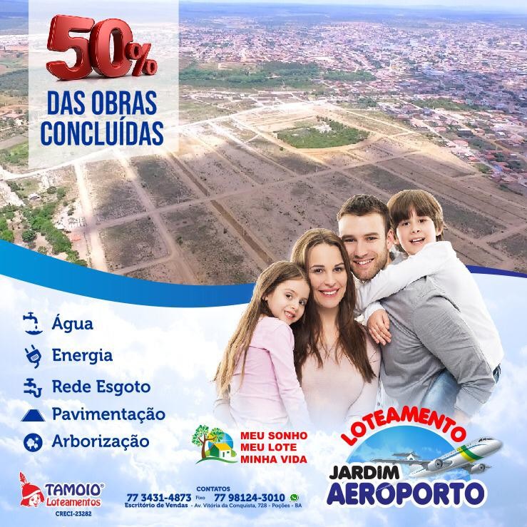 As obras do loteamento Jardim Aeroporto estão adiantadas. O prazo de entrega é para dezembro de 2020, mas a Tamoio Loteamentos já concluiu mais de 50% da construção. Já foram realizadas as obras das redes de água e esgoto, águas pluviais e a instalação de postes em todo loteamento. O Jardim Aeroporto é um sucesso de vendas! Os últimos lotes estão disponíveis. Prestações a partir de R$ 230,00 mensais, sem entrada! Plantão de Vendas: Avenida Vitória da Conquista, 728. Fone: (77) 3431-4873 ou Whatsapp: (77) 98124-3010.