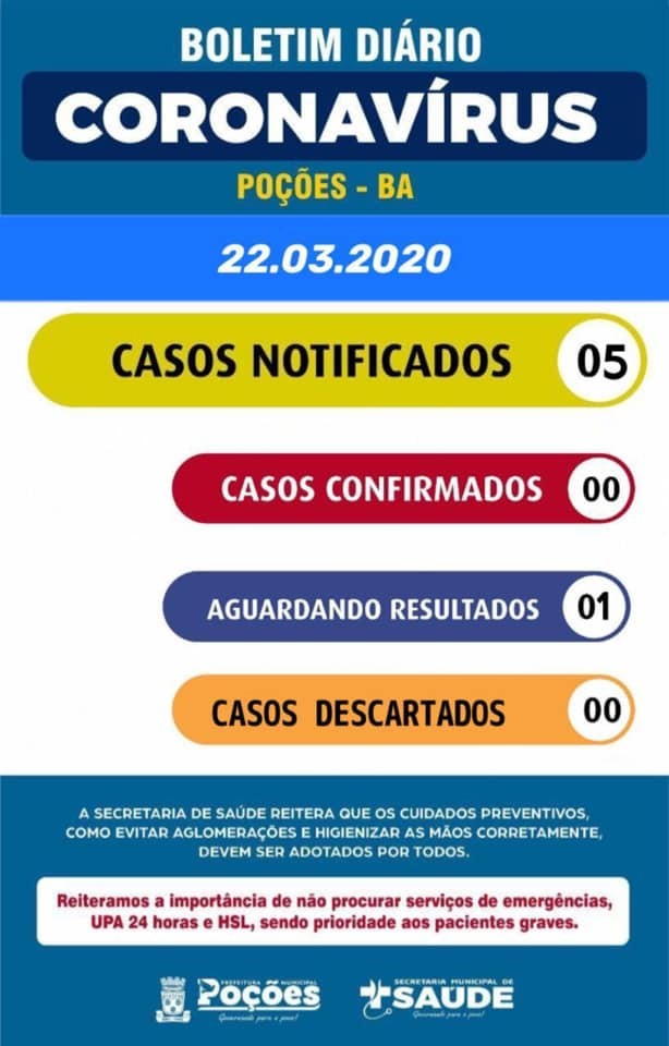 Em nota divulgada na noite deste domingo pelo prefeito de Poções, Léo Mascarenhas, e pelo Vice-prefeito e secretário de saúde, jorge Luis, foi divulgado que subiu para cinco os casos notificados no município. confira a nota na integra: No dia 22 de março de 2020, às 20:00 horas, a Secretaria Municipal de Saúde de Poções – Bahia informa à comunidade poçoense que, até o presente momento foram notificados cinco casos suspeitos de COVID19 em Poções – Bahia, desses, três pacientes encontram-se em quarentena domiciliar e dois internado em isolamento em unidades hospitalares do nosso município. Todas essas condutas foram baseadas em protocolos e recomendações expedidas pela Secretaria de Saúde do Estado da Bahia (SESAB) e Ministério da Saúde (MS). No contexto de fiscalização fomos informados sobre a chegada de três ônibus provenientes do município de São Paulo – SP, com poçoenses objetivaram cumprir a quarentena decretada nos diferentes estados em Poções – Bahia, para tal, a secretaria de saúde já montou uma equipe que interceptará os ônibus e registrar, por meio de cadastro físico, como nome, dados pessoais e endereços de todos os recém chegados, com objetivo posterior de fiscalizar o cumprimento adequado da quarentena, em isolamento domiciliar, sob risco de cumprimento de determinações legais já expedidas pelo Ministério da Justiça. Uma sub-comissão de fiscalização e acompanhamento já foi criada e já tem dados atualizados de todos os pacientes que se encontram em quarentena domiciliar, sintomáticos ou não, acompanhados por equipe de saúde multiprofissional (Agentes Comunitários de Saúde, técnico de enfermagem, enfermeiros, odontólogos e médicos).
