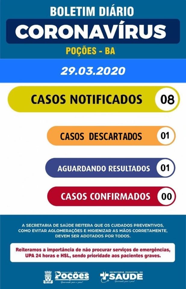 No dia 29 de março de 2020, às 20:00 horas, a Secretaria Municipal de Saúde de Poções (Ba) informa à comunidade poçoense que até o presente momento mantemos notificados oito casos suspeitos de COVID19, sendo que desses, seis pacientes encontram-se em quarentena domiciliar e dois internados em isolamento hospitalar. Todas essas condutas foram baseadas em protocolos e recomendações expedidas pela Secretaria de Saúde do Estado da Bahia (SESAB) e Ministério da Saúde (MS). A Secretaria de Saúde do município reitera mais uma vez que os decretos, as recomendações de sociedades civis, comoções sociais expedidas em mídias tem por objetivo efetuar a principal medida eficaz da diminuição da possibilidade de propagação do vírus, que é o isolamento social.