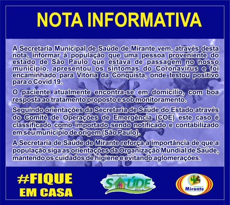 O município de Mirante registrou um caso importado de coronavírus nesta segunda-feira (11). O caso importado é quando a pessoa está na cidade mas é natural de outro município. Confira a nota da secretaria municipal de saúde: