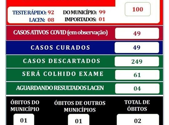 Boletim epidemiológico: 100 casos confirmados, sendo 01 importado e 49 curados