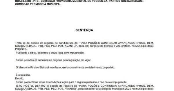 A Justiça Eleitoral da 059ª Zona Eleitoral de Poções/BA aprovou nesta terça-feira (06) o registro da candidatura de Leandro Araújo Mascarenhas (PTB) a prefeito de Poções nas eleições deste ano. Léo de Tonhe Gorgo, forma a coligação “PARA POÇÕES CONTINUAR AVANÇANDO” formado por diversos partidos, dentre eles, o PSD, que tem Gênesis Leite (Geninho) como ... -