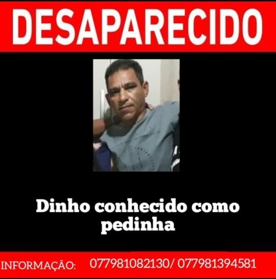 O senhor Alenido Correia de Almeida conhecido como Dinho chamado popularmente de ”Pedinha” está desaparecido desde o dia 02 de junho. Segundo informações da família a última vez que foi visto estava trajado com uma camisa rosa escuro, bermuda jeans e mochila cinza, pedinha tem uma deficiência nos dois primeiros dedos da mão direita em decorrência de um acidente de trabalho ocorrido há alguns anos atrás. Segundo a esposa de Alenido, foi encontrada em uma fazenda na região Pau de Colher a mochila que ele usava mais nenhuma informação sobre o seu paradeiro. Populares dizem ter visto um homem com as mesmas características dele nas regiões do Roçado grande,Piedade e Lagoa Nova, a família foi até essas localidades, porém, sem êxito. Caso tenha alguma informação que possa ajudar entre em contato com a família pelos telefones: (77)9 81082130 ou (77) 9 81394581. Liberdade FM
