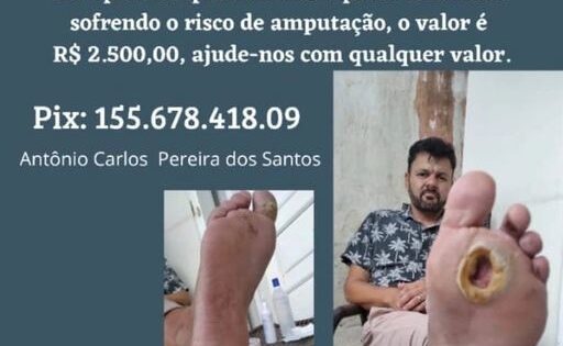 Seu Antônio Carlos, pessoa muito querida na cidade de Poções, precisa de nossa ajuda e solidariedade, para vencer as dificuldades da diabetes. A doença é crônica e causa feridas nos pés, como as que podemos ver nas fotos. Se essa parte necrosada não for retirada a tempo, por meio de cirurgia, ele pode vir a ... -