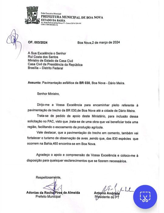 “Hoje entregamos ao Ministro @ruicostaoficial a solicitação da pavimentação asfáltica do trecho da BR-030, que liga Boa Nova a Dário Meira. O Ministro, que obteve a maior votação da história do nosso município, com certeza incluirá no PAC o sonho da população de Boa Nova, Valentim e das cidades circunvizinhas!” compartilhou Antonio em suas redes sociais.
