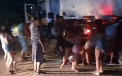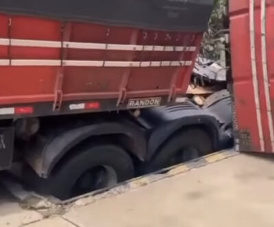 Carreta afunda no piso e tomba sobre carro no posto fiscal de Vitória da Conquista