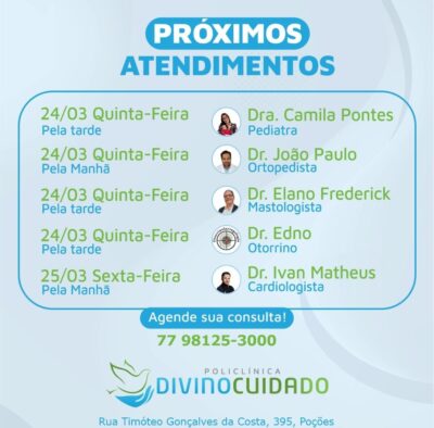 Divino Cuidado está recheada de especialistas para cuidar de você! Confira os próximos atendimentos médicos e garanta a sua consulta! -