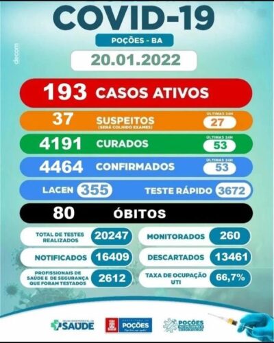Poções registrou, até esta quinta-feira (20/01), o total de 4464 casos confirmados da Covid-19. Destes, 4191 estão recuperados e 193 continuam em recuperação. No ... -