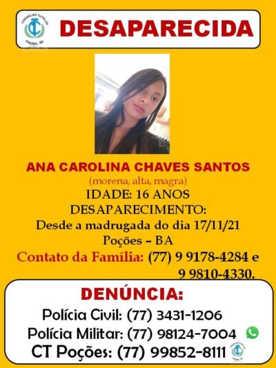 Uma garota de apenas 16 anos está desaparecida em Poções. Ana Carolina Chaves Santos desapareceu desde a madrugada desta quarta-feira (17). Ela é alta, ... -