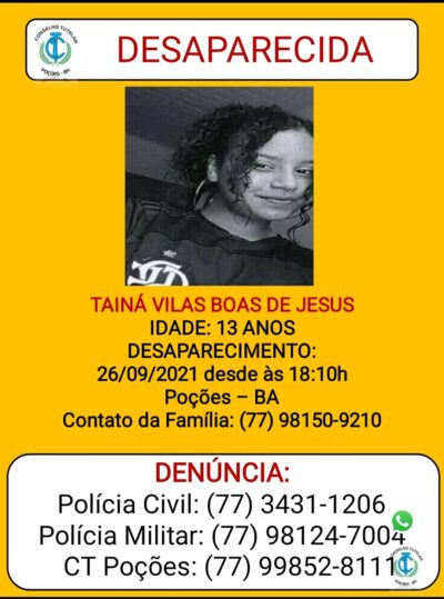 Dois adolescentes, com idades entre 13 e 16 anos, desapareceram desde domingo (26), em Poções. Tainá Vilas Boas de Jesus e Lucas Moreira Soares ... -