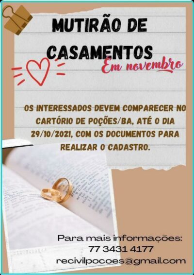 O Cartório de Registro Civil vai realizar mais um mutirão de casamento em Poções. Os interessados devem comparecer no cartório de Poções até o ... -