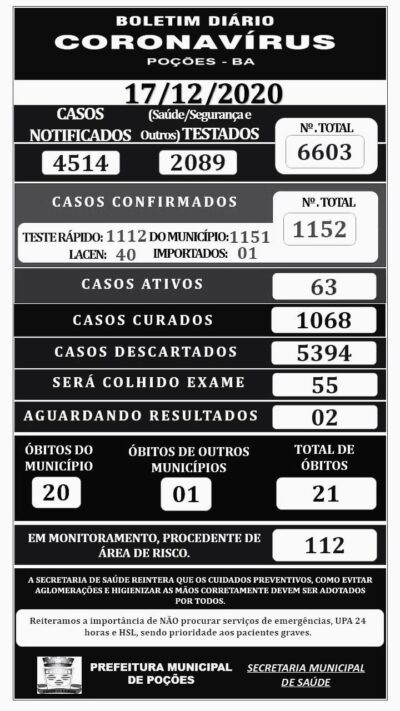 Com nota de pesar, o boletim desta quinta (17) foi divulgado, confirmando mais um óbito por Covid em Poções. Os casos ativos e suspeitos ... -