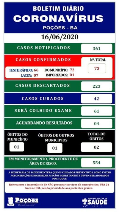 Conforme dados da Secretaria Municipal de Saúde de Poções, mostram que, dos 73 casos confirmados de covid-19 na cidade até está última terça-feira (16), ... -