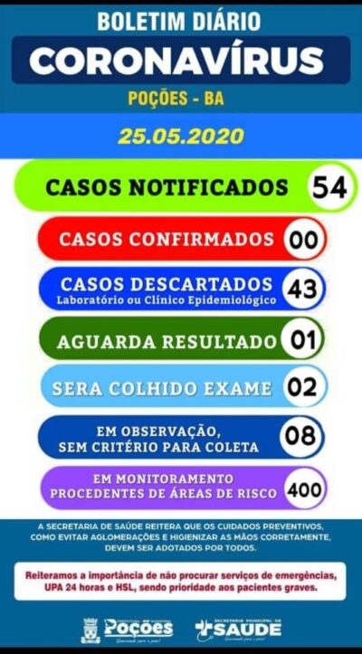 Nesta segunda-feira (25/05), a Secretaria Municipal de Saúde de Poções informa que temos 54 casos com suspeita de Covid-19. Ainda de acordo com os ... -