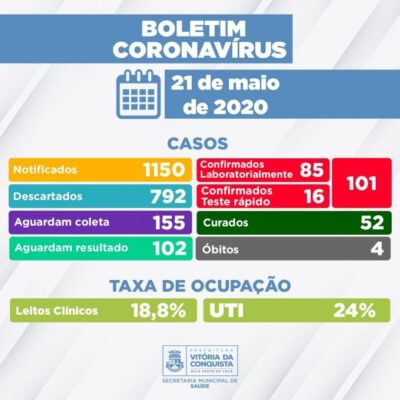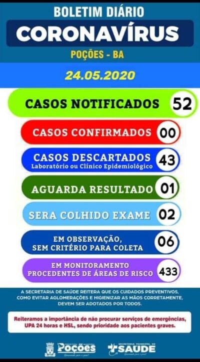 Neste domingo (24/05), a Secretaria Municipal de Saúde de Poções informa que temos 52 casos com suspeita de Covid-19. Ainda de acordo com os ... -