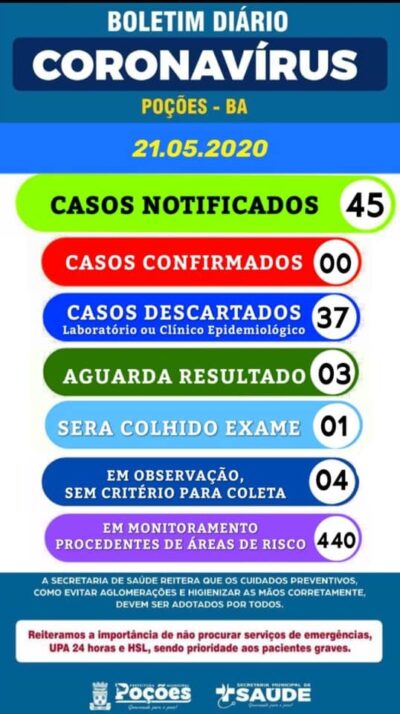 Nesta quinta-feira (21/05), a Secretaria Municipal de Saúde de Poções informa que subiu para 45 o número de casos com suspeita de Covid-19. Ainda ... -