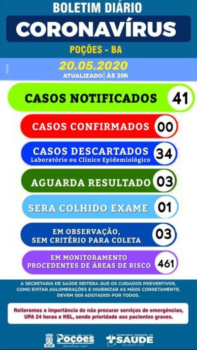 Nesta quarta-feira (20/05), a Secretaria Municipal de Saúde de Poções informa que subiu para 41 o número de casos com suspeita de Covid-19. Ainda ... -