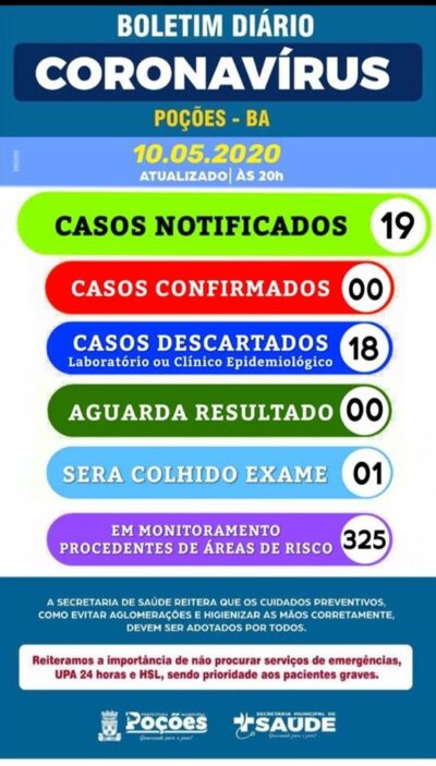 Neste domingo (10/05), a Secretaria Municipal de Saúde de Poções informou que a cidade tem 1 caso com suspeita de Covid-19. Foi ressaltado que ... -