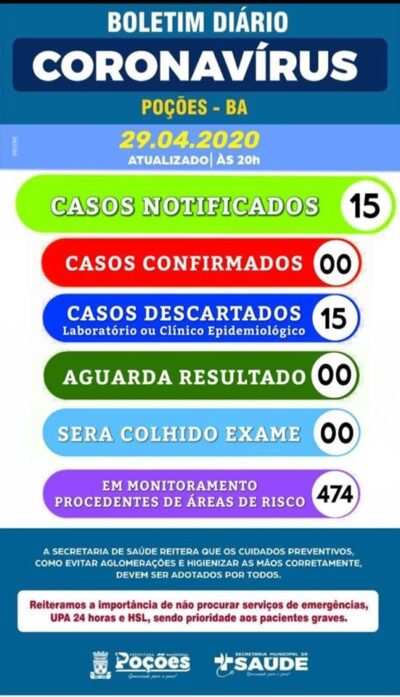 Nesta quarta-feira (29/04), a Secretaria Municipal de Saúde de Poções informa que mantemos notificados 15 casos com suspeita de Covid-19. Ressaltamos que temos 15 ... -