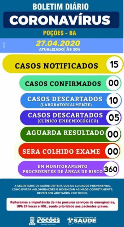 Nesta segunda-feira (27/04), a Secretaria Municipal de Saúde de Poções informa que mantemos notificados 15 casos com suspeita de Covid-19. Ressaltamos que subiu para ... -