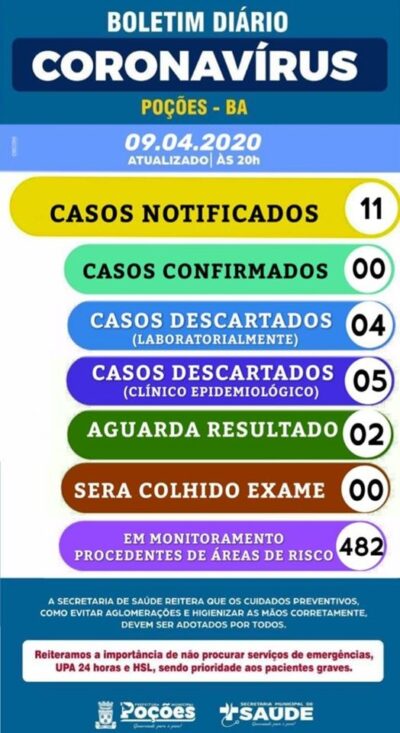 Nesta quinta-feira (09/04), a Secretaria Municipal de Saúde de Poções informa que temos notificados 11 casos com suspeita de Covid-19. 04 casos suspeitos já ... -