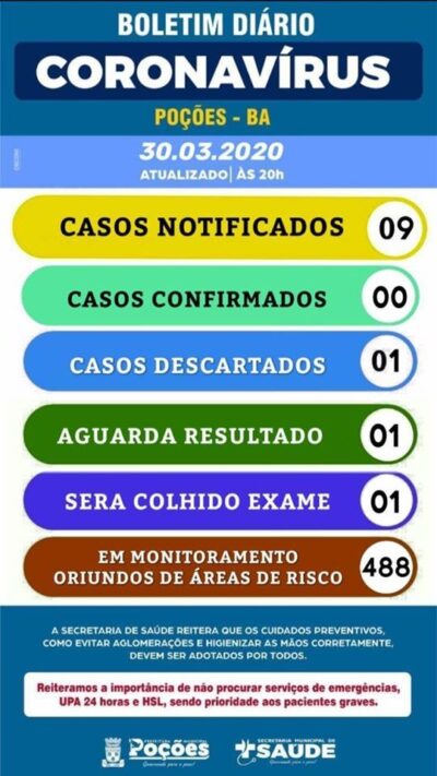 No dia 30 de março de 2020, às 20:00 horas, a Secretaria Municipal de Saúde de Poções (Ba) informa à comunidade poçoense que até ... -