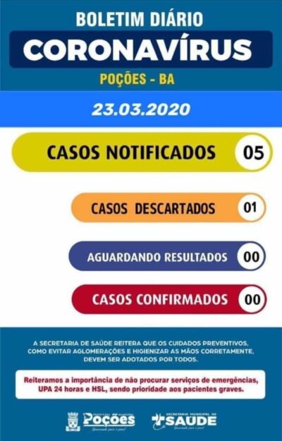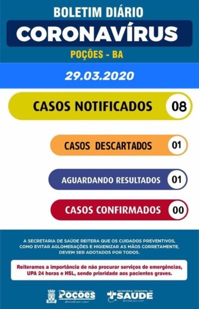 No dia 29 de março de 2020, às 20:00 horas, a Secretaria Municipal de Saúde de Poções (Ba) informa à comunidade poçoense que até ... -