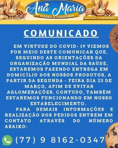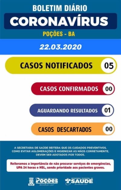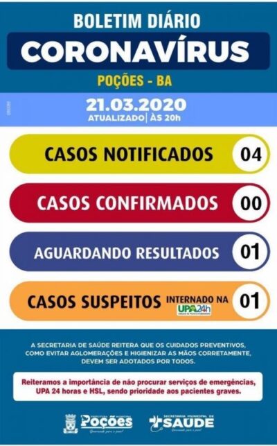 No dia 21 de março de 2020, às 20:00 horas, a Secretaria Municipal de Saúde de Poções – Bahia informa à comunidade poçoense que, ... -