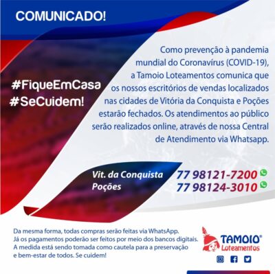 Como prevenção à pandemia mundial do Coronavírus (COVID-19), a Tamoio Loteamentos comunica que os nossos escritórios de vendas localizados nas cidades de Vitória da ... -