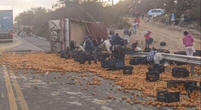 Boa Nova: Caminhão carregado de tangerina tomba na BR-116, trecho do entroncamento