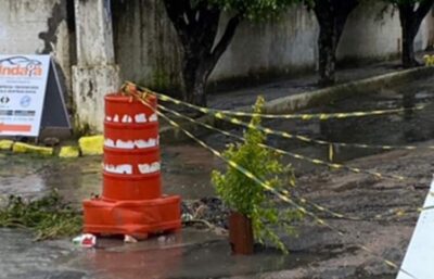 Buraco na Avenida Cônego PIthon ganha árvore de Natal improvisada e pedido de solução ao Papai Noel