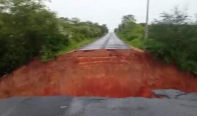 Chuva destrói pista, abre cratera e engole carro na BR-030 em Boa Nova